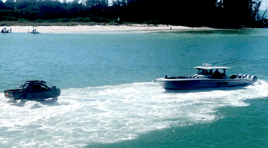 This could be titled “The Mistake By The Lake,” though it happened between Longboat Key and Bradenton Beach, Florida. From a large amount of air in those eight tires it miraculously did float. We’re not sure whether WhislinDiesel planned it or just lucked out. Of course, in spite of the truck having four-wheel steering and the rotation of the tires moving the truck forward the whole enterprise was still doomed.