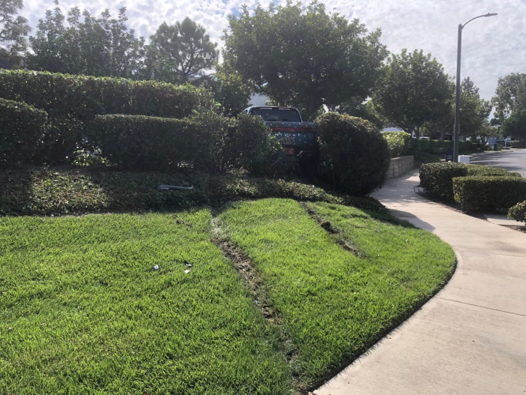 The R1T electric truck came to a stop after hitting a Mercedes-Benz S550. Based on the other photos presented, the electric truck went through the bushes and a shrub pretty quickly. There are significant tire marks leading to the shrub where the back end of the truck can be seen.