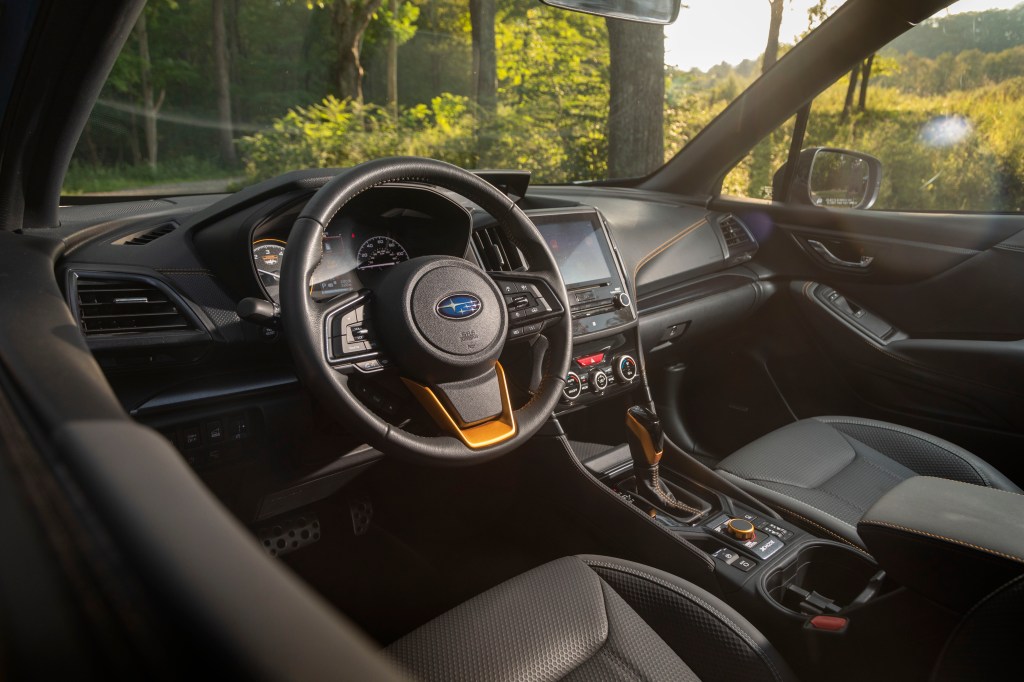 The Forester Wilderness trim has 9.2 inches of ground clearance, which is half an inch higher than the other Forester models. The extra clearance enables the Wilderness to drive over rocky and debris-laden terrain with greater ease. Excellent traction, especially on gravel or muddy surfaces, comes courtesy of the Yokohama GEOLANDAR all-terrain tires. The tires wrap around the unique 17-inch alloy wheels, which have a matte black finish and elevated white letters. For peace of mind when hitting the trails, the Wilderness trim has a full-size spare tire that’s located under the cargo area.