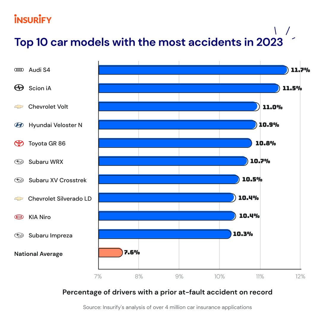 If the Audi S4, Scion iA, and Chevy Volt were surprising entries on the list, you might be more surprised that some performance cars rounded out the Top 10. The most notable makes and models include the Hyundai Veloster N, Toyota GR86, and Subaru WRX. Over 10% of the owners of these models reported having at-fault accidents. Check out the other cars that made Insurify’s list of the “Top 10 Cars with the most accidents for 2023.”