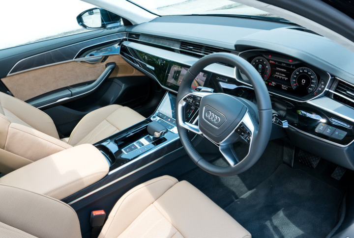 The Audi A8 is a luxurious car that blends modern technology with elegant design to create a beautiful and futuristic interior. The Premium Valcona leather upholstery and genuine wood inlays make you feel warm and cozy while inside. The A8’s MMI infotainment system is seamlessly integrated into the cabin, with dual touchscreens allowing easy access to navigation, entertainment, and vehicle settings. You can even add optional features like massaging seats and a Bang & Olufsen sound system to improve your driving experience!