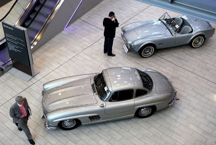 The 1957 Mercedes-Benz 300SL “Gullwing” was easily identified by the upward-opening gullwing doors, which provided a striking visual appeal. This quality was also a practical solution to the car’s high sills and chassis structure. The 300SL is driven by a 3.0-liter inline-six engine equipped with a mechanical direct fuel injection system. Its engine produced 215 horsepower, enabling the car to reach a top speed of about 160 mph.