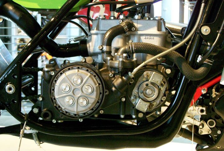 Kawasaki released the Kawasaki KR2350 in the late 1970s with a tandem twin engine that featured two cylinders arranged one behind the other, as opposed to the more common side-by-side twin arrangement. This configuration allowed for a narrow engine profile while still delivering the power of a twin-cylinder engine. Although it performed well on the track, the engine design was too niche for widespread commercial production.