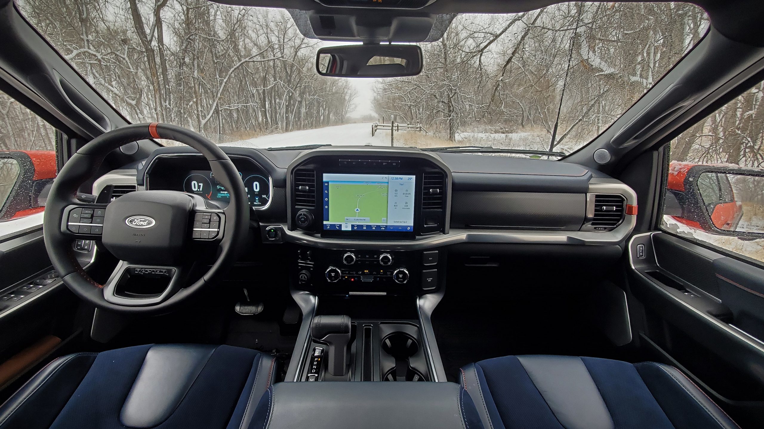 So, before I get to what all this has to do with the Bronco Raptor, let’s talk about what the 2021 Ford Raptor is like to drive. My loaner came with the optional $7,500 37 Performance Package. That means (you guessed it) 37″ tires, as well as beadlockable 17-inch wheels, upgraded Fox shocks (for better yumps), and more ground clearance as a result of those tires. Obviously, being all-terrain tires, they handle all terrains well. You can’t get a Raptor 37 stuck. Thankfully, highway noise is at a minimum and the cameras help immensely with parking this monster. The interior is very nice, blue, and has Carplay and Android Auto. Finally, I have realized I will simply die if I go through another winter without a heated steering wheel and remote start.