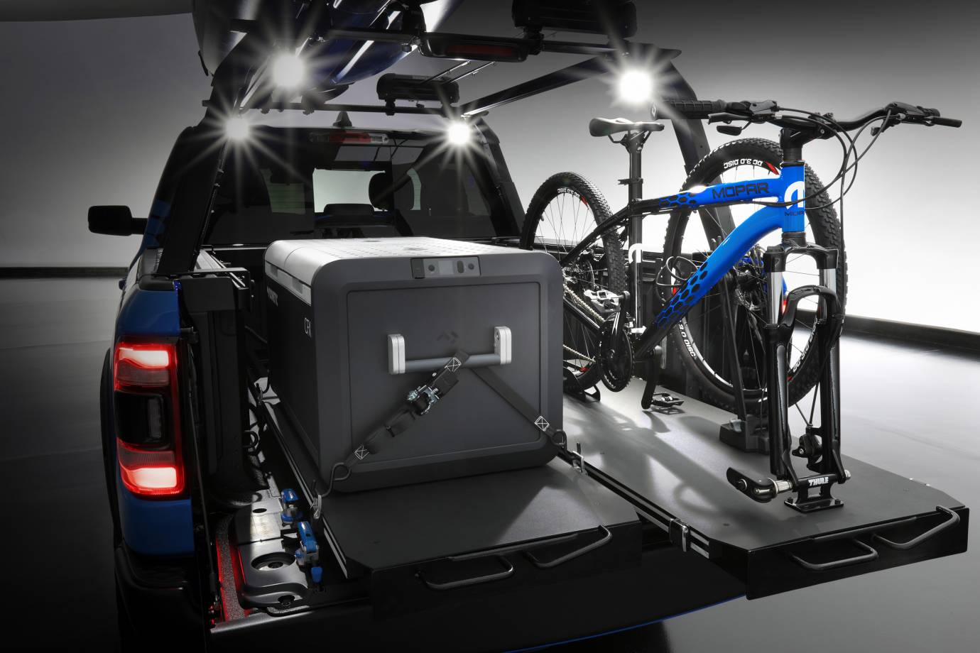 A Mopar adjustable bed rack can double for work as well as play holding things like kayaks and surfboards. The Expertec bed-slide system was added to the bed and can handle up to 2,000 lbs. Added to the slides are a Dometic refrigerator and those mountain bikes. Bold blue graphics announce this is no production truck.