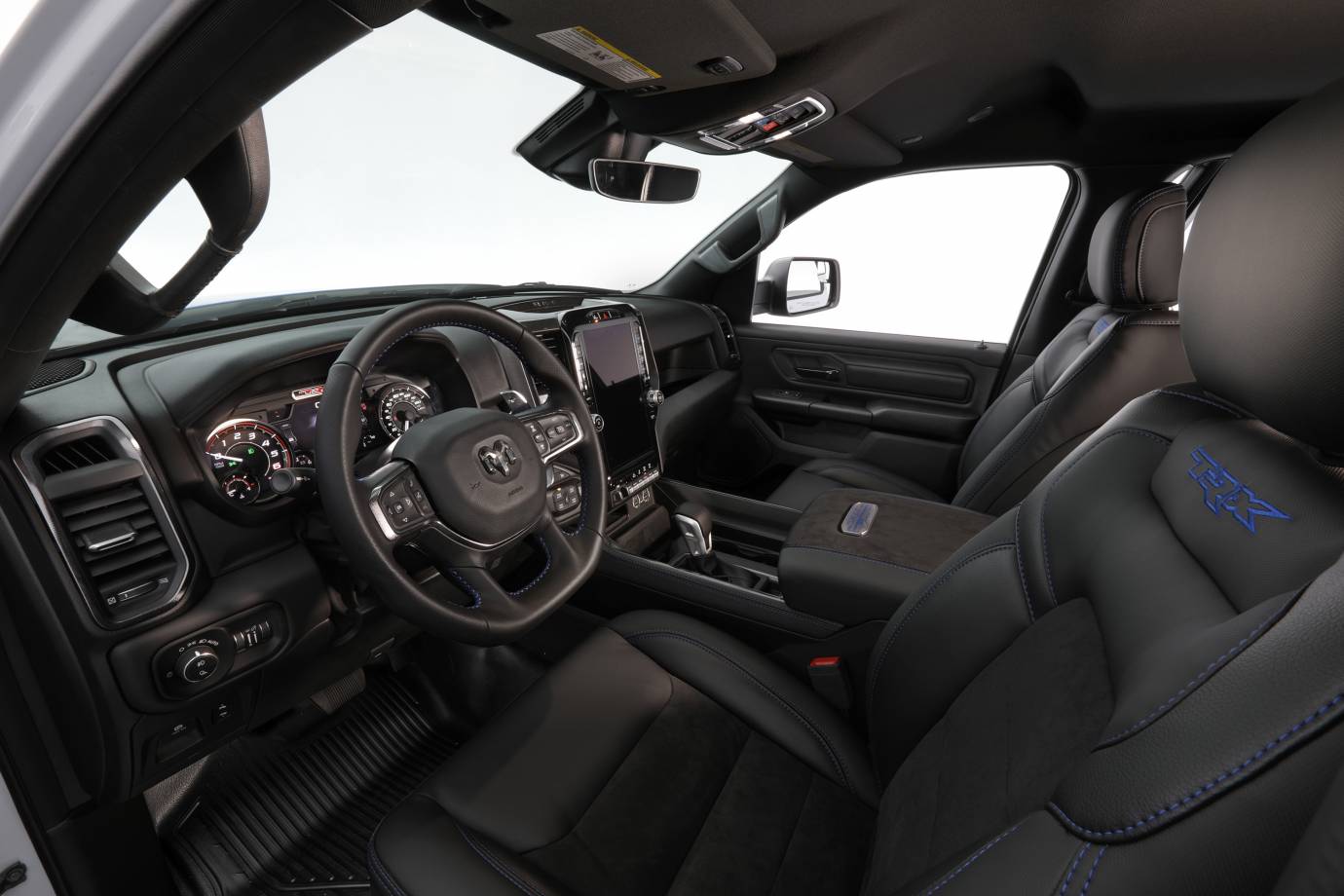 A stylized custom desert runner, the RexRunner runs a 702 hp TRX engine and transmission. The 37-inch tires support the package that includes the Ram Bar, bed-mount spare tire carrier, and more. Custom skid plates show off the off-road chops. Inside, the Tradesman bin has been robbed of the one-piece molded door panels and vinyl flooring. They’re cheap-looking in the stripper Rams, but functional-looking for this concept.