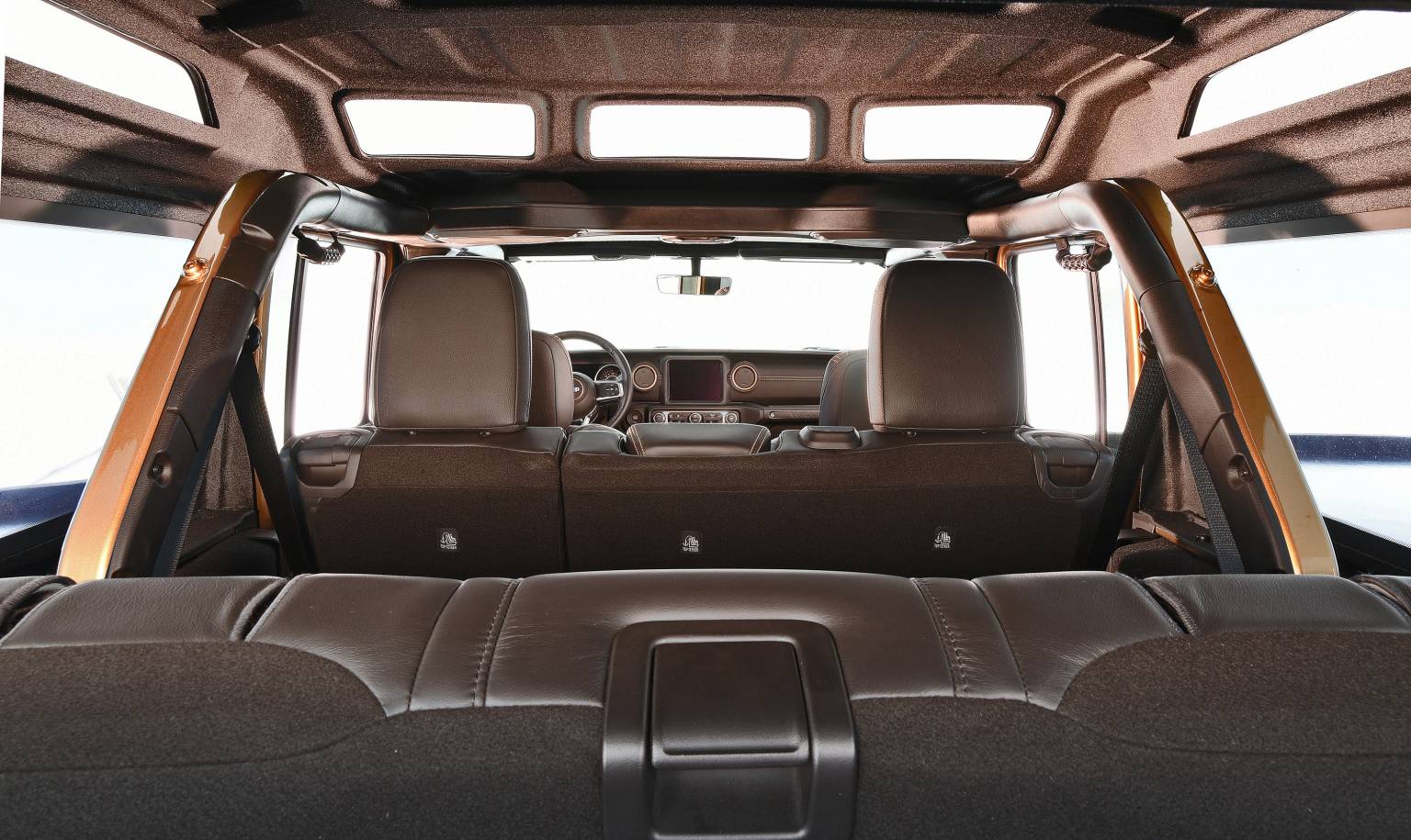 The safari top adds five inches for not only headroom but added viewing windows. A two-inch lift kit, side steps, steel front bumper, off-road lights, and a lot more Jeep Performance Parts make up the rest of the concept. In the back, a custom rear bumper was fabb’d, and inside a Katzkin leather-wrapped steering wheel and dash add some luxury. Sahara Bronze stitching for added detail, custom suede seat inserts, and embroidered Jeep logos finish off the custom touches.