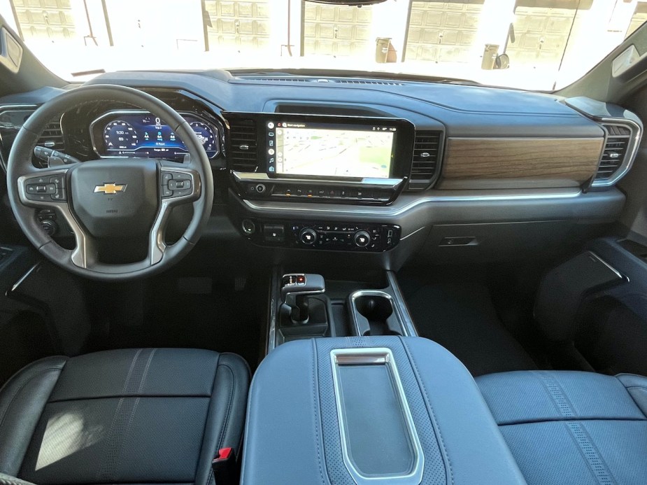 The 2022 Silverado is comfortable enough to take on a drive from one coast to the other. GM did well when appointing the Silverado’s interior with well-crafted materials. Of course, our High Country test model came with open-pore wood trim and premium leather upholstery, which made the experience feel more high-class. However, the seats themselves were comfortable, and the amount of head and legroom in all parts of the cabin was impressive.