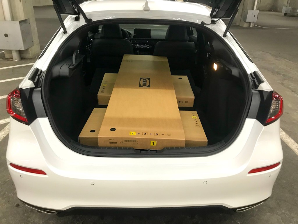 Those numbers might not sound like anything special, but consider that rivals like the Mazda3 and Subaru Impreza each only have around 20 cubic feet of space in their cargo areas. But the real test of the Civic’s boot room was when I had to buy a dresser at IKEA. I backed into the loading spot and had no worries that the three boxes that made up my newly acquired clothes bin would fit in the car. However, I didn’t think it would cut it so close.