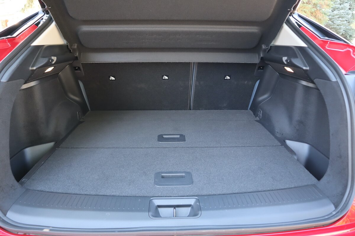 The Ariya’s backseat folds flat, which enhances its cargo-carrying capacity. Nissan says it has 16.5 cubic feet of storage space in the front-drive models and 14.6 cubic feet in the AWD models. What makes the Ariya’s cargo hold even better is its divider that creatively uses the space and the under-floor storage area to conceal items when needed.