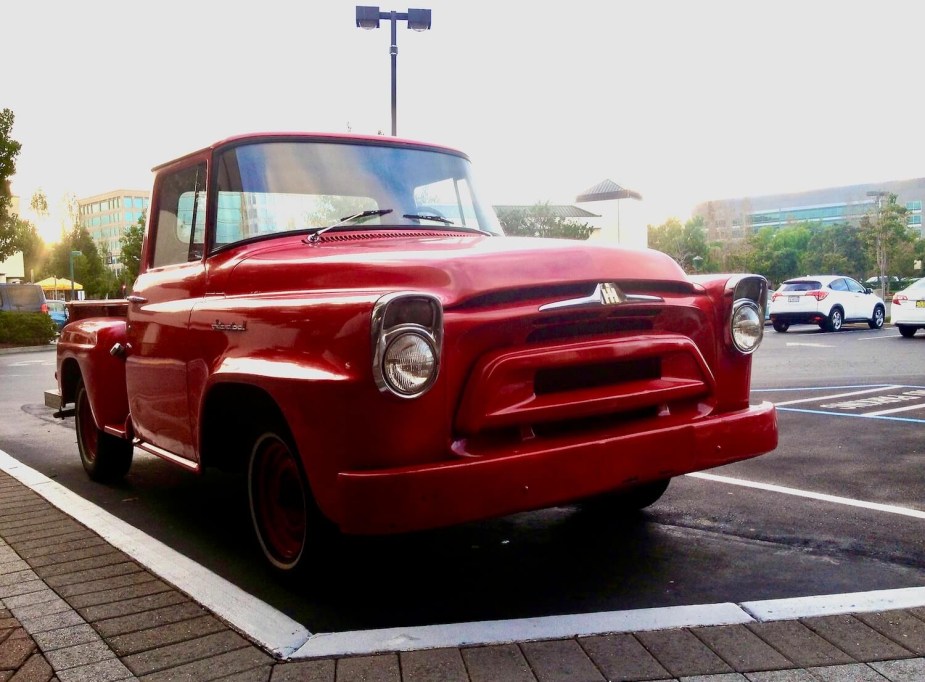 Yes, International Harvester made pickup trucks! This company, known for its tractors, heavy trucks, and “Scout” SUV, made pickups until 1975. This beautiful red step-side appears to be from model years 1957-59. It belongs to the “A line” truck series that IH debuted for the 50th anniversary of its first truck.