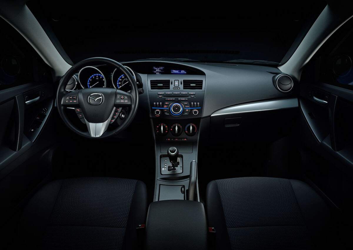 As for features, the base-model sedan had cloth seats, a four-speaker audio system, steering-wheel-mounted audio controls, and remote keyless entry. Optional features included heated front seats, leather upholstery, and a power moonroof. As for the hatchback, some trims, including the Mazdaspeed3, boasted a sport-tuned suspension, aluminum foot pedals, integrated fog lights, and a rear spoiler.