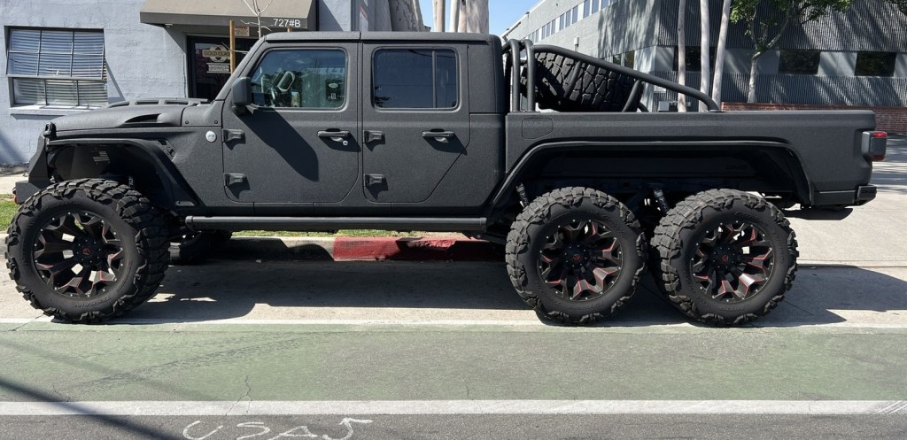 What is it with six-wheel conversions in L.A? They certainly look cool, and when you want to make an impression this will do it. Black on black, with a convertible roof makes this one look the business, and the owner, David, says you can use it for photo shoots and take the roof and doors off. A Gladiator isn’t exactly an exotic SUV rental, but a 6×6 makes this one.