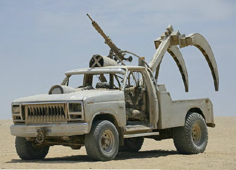 A 1942 Buick sloper sedan with jacked-up duallys and anti-aircraft guns aplenty. This is the personal guard for The Gigahorse and Immortan Joe.