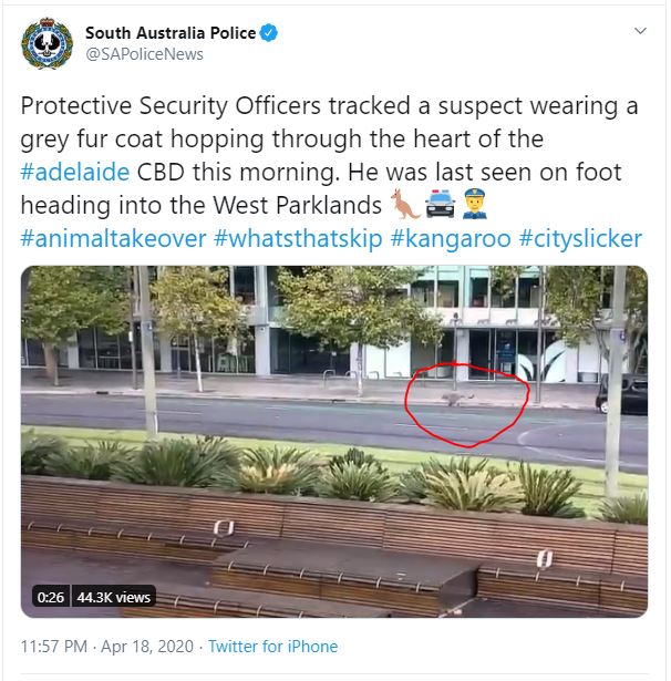 The South Australia Police Twitter and Facebook accounts yesterday posted a short video of a kangaroo hopping its way down a roadway. The street is in the town of Adelaide.
