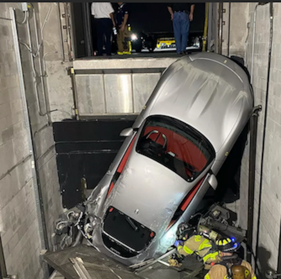 A company called Kauff’s Towing brought in a new type of wrecker to attempt to pluck the Ferrari out of its elevator shaft tomb. The company brought in a rotator wrecker for the removal. It uses a 45-foot boom in conjunction with 50,000 lb winches. There were no reports of any injuries.