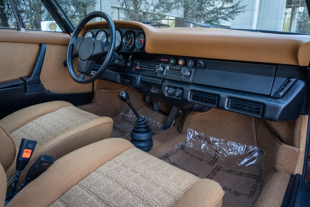 Being a mid-range 1970s air-cooled Porsche 911, the equipment list on this 911 S isn’t extensive. It has front fog lights, pop-out rear quarter windows, A/C, and a period aftermarket radio. But it does ride on Fuchs alloy wheels and the seats have tweed inserts.
