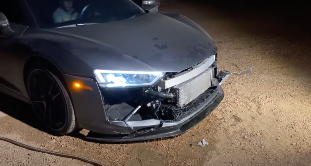 The Audi R8 broke initially when WhistlinDiesel hit a fox while driving on a rural road. This impact shattered the front bumper, grille, and carbon-fiber splitter. However, the most severe damage from this impact was sustained by the car’s front-mounted radiators. After leaking a significant amount of coolant, the supercar began to overheat.
