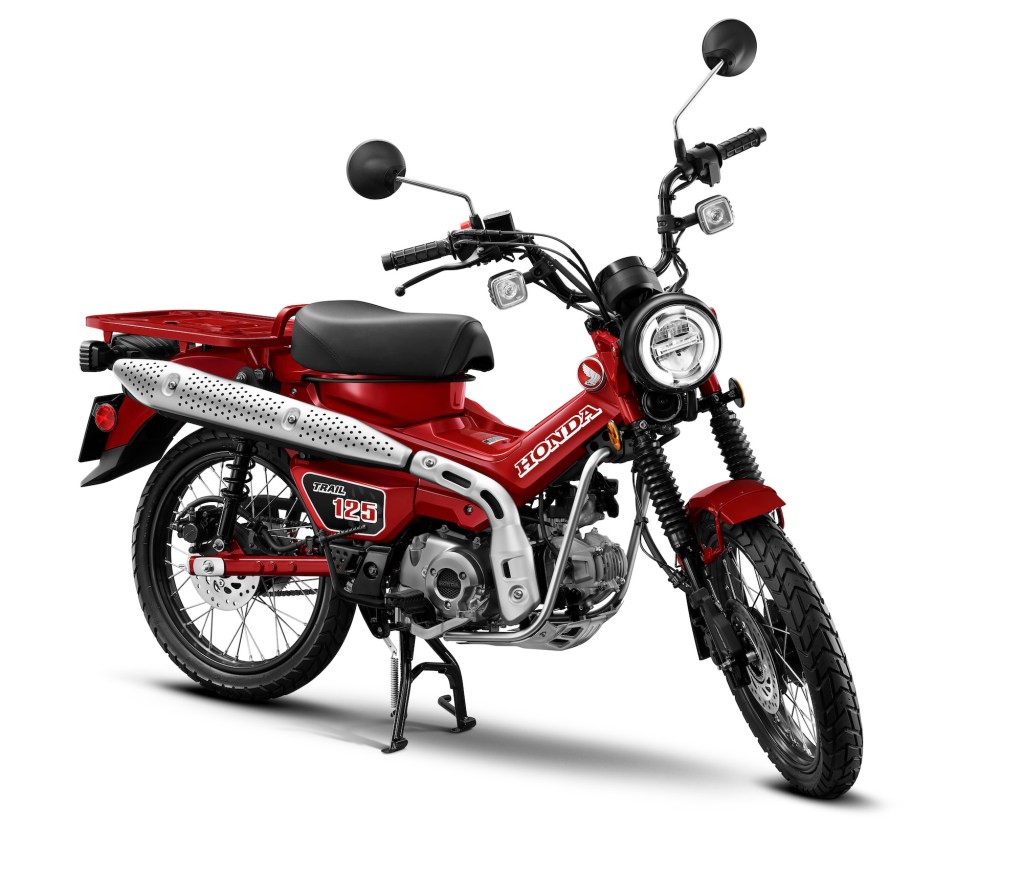 If you like the Super Cub, but wish you could take it off-road, then the Honda Trail125 is what you seek. The Trail125 builds upon that ever-popular platform. However, it offers a longer wheelbase, a more rugged construction, and plenty of ground clearance for some light off-road riding. A larger front fork tube adds to the dirt-riding equation as do the high-mounted air intake and new exhaust system. Additionally, that adds more power and torque, according to Ultimate Motorcycling.