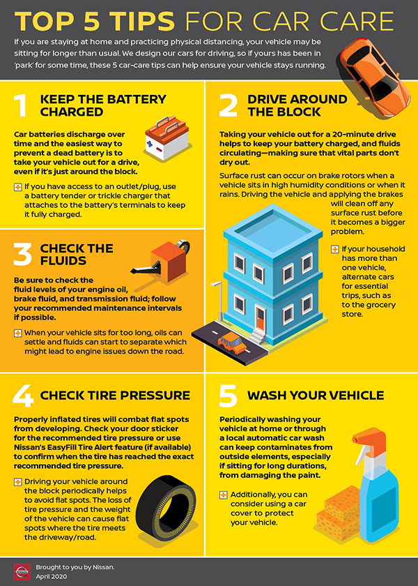 There are a few simple vehicle-care techniques for drivers to remember when they may not be driving or driving infrequently. Here are five car care tips from Nissan to keep your car in shape during this time.