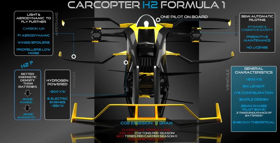 The design duo of former fighter pilot Thierry de Boisvilliers and former Airbus veteran Michael Krollak, first conceived of a flying car race series. But there could be no C02 emissions. The choice of hydrogen may not be the best for that intent, however. Hydrogen is not the most carbon neutral, due to processing and transportation issues.