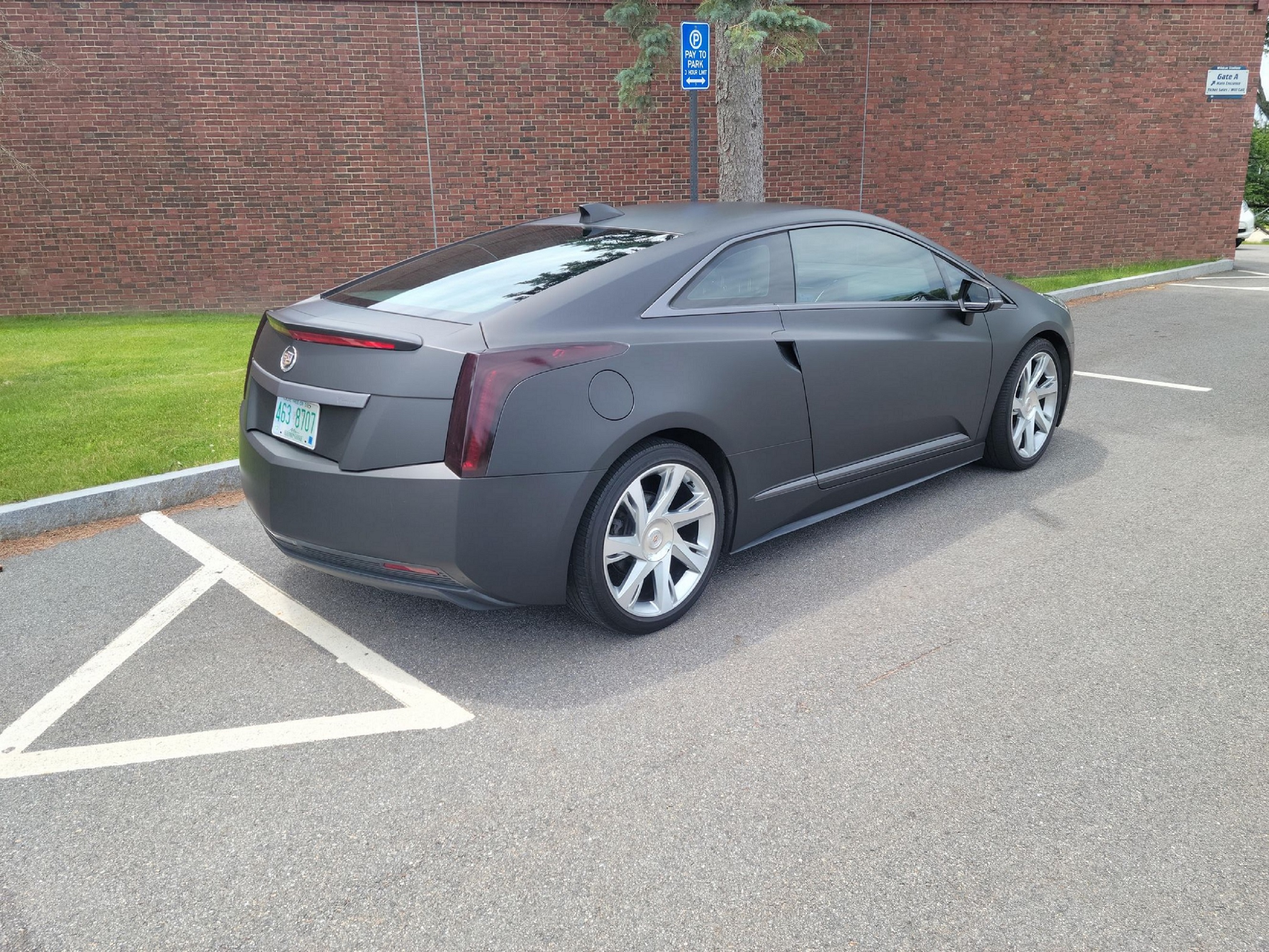 Technically, this 2014 Cadillac ELR has Ashen Gray paint. However, it now wears a black vinyl wrap, including on its bright exterior trim pieces. Furthermore, it has tinted rear and side-marker lights. Other than that, though, it’s stock.