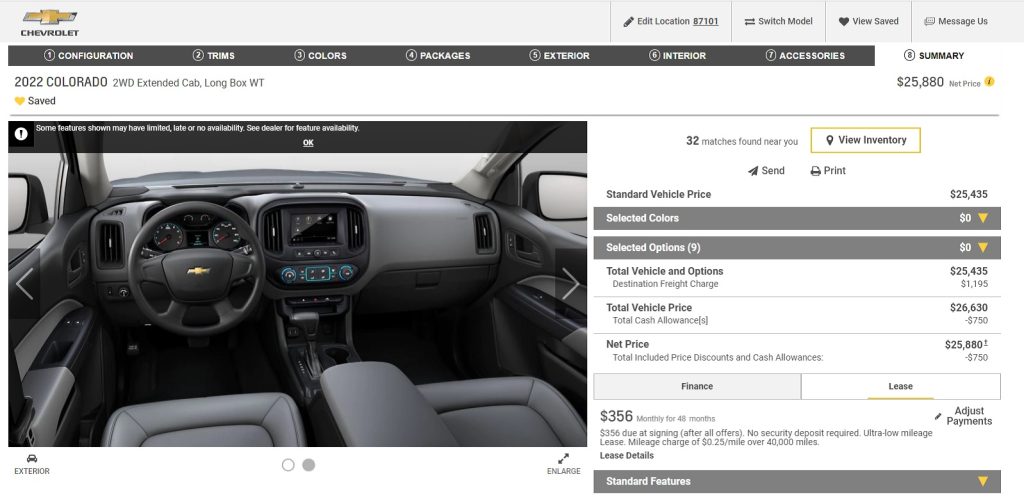 Even if you use Chevrolet’s online configuration tool, it’s hard to order one for just $25,200. Part of that reason is because basics like cruise control are part of the $530 Work Truck Convenience Package, which adds remote keyless entry, and because there are so many trim levels to pick from. Also, Chevrolet does charge a small destination fee. But, with no options checked, a four-cylinder engine, and in basic white, you can order a brand new Chevrolet Colorado W/T for $25,880, based on today’s incentives.