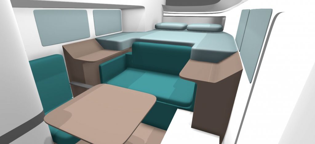 Hidden away are a 24-gallon water tank, battery with 100WP solar, and gas compressor for the cooker. The kitchen measures approximately four feet. The German company offers lots of options to increase electrical capabilities, outside awnings, reconfiguring the interior spaces, and more.