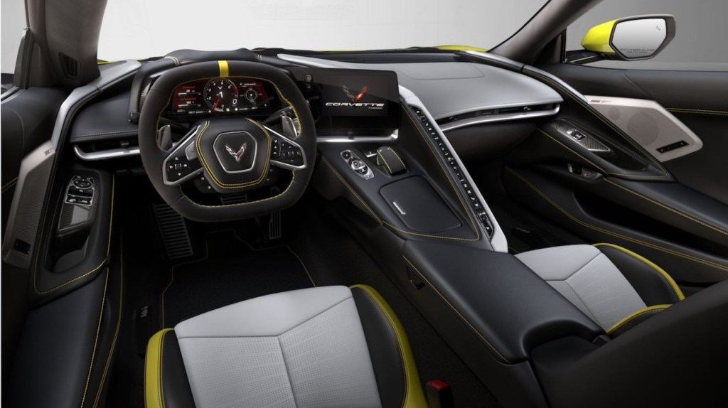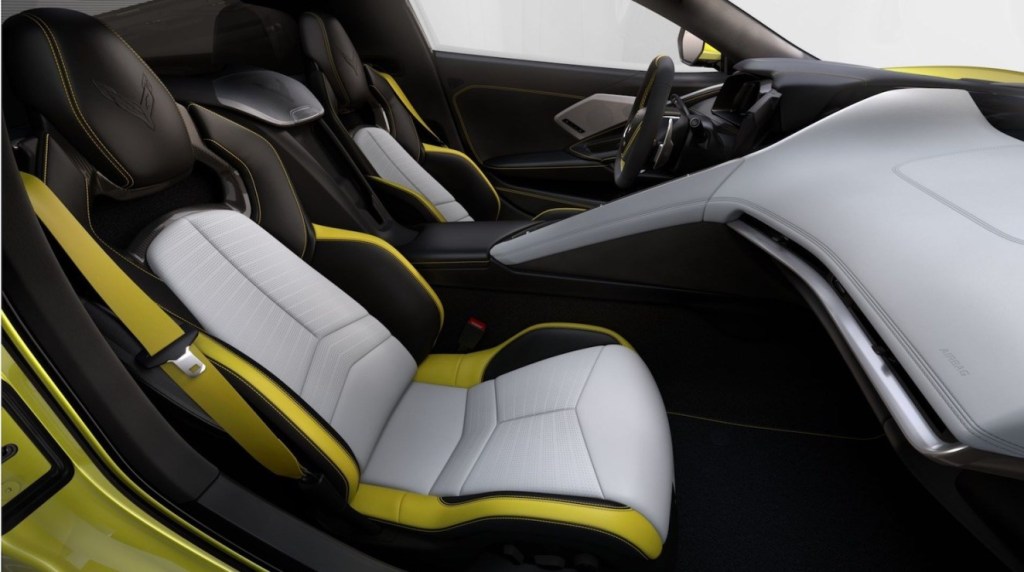 The Sky Cool Gray/Strike Yellow interior option is new for 2021. Because you wouldn’t want just a single leather color. No, you need something gaudier. So with this 3LT trim option interior, you get black seats with gray inserts sprinkled with yellow stitching. It represents the Corvette Racing livery used in the last few years.