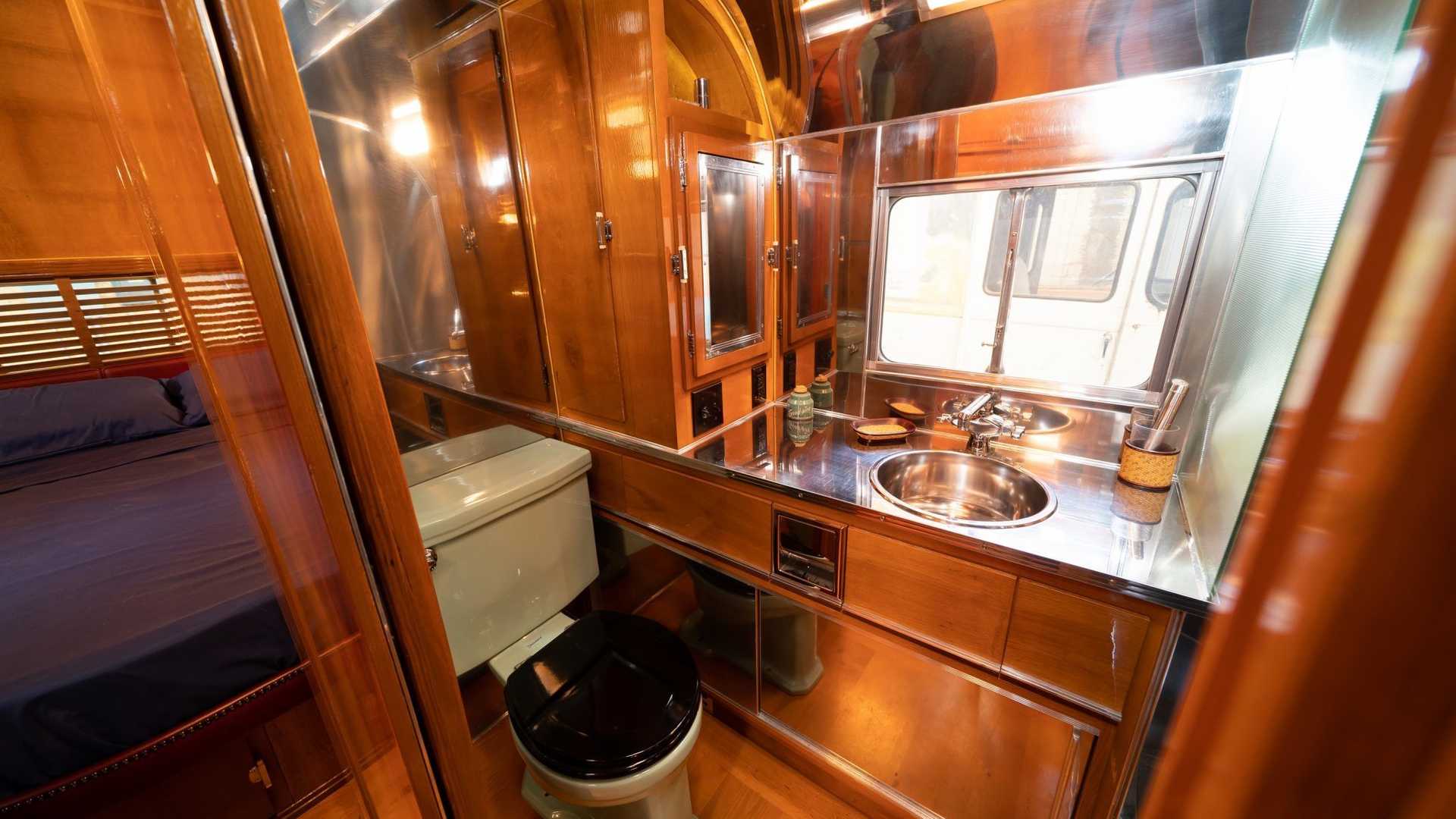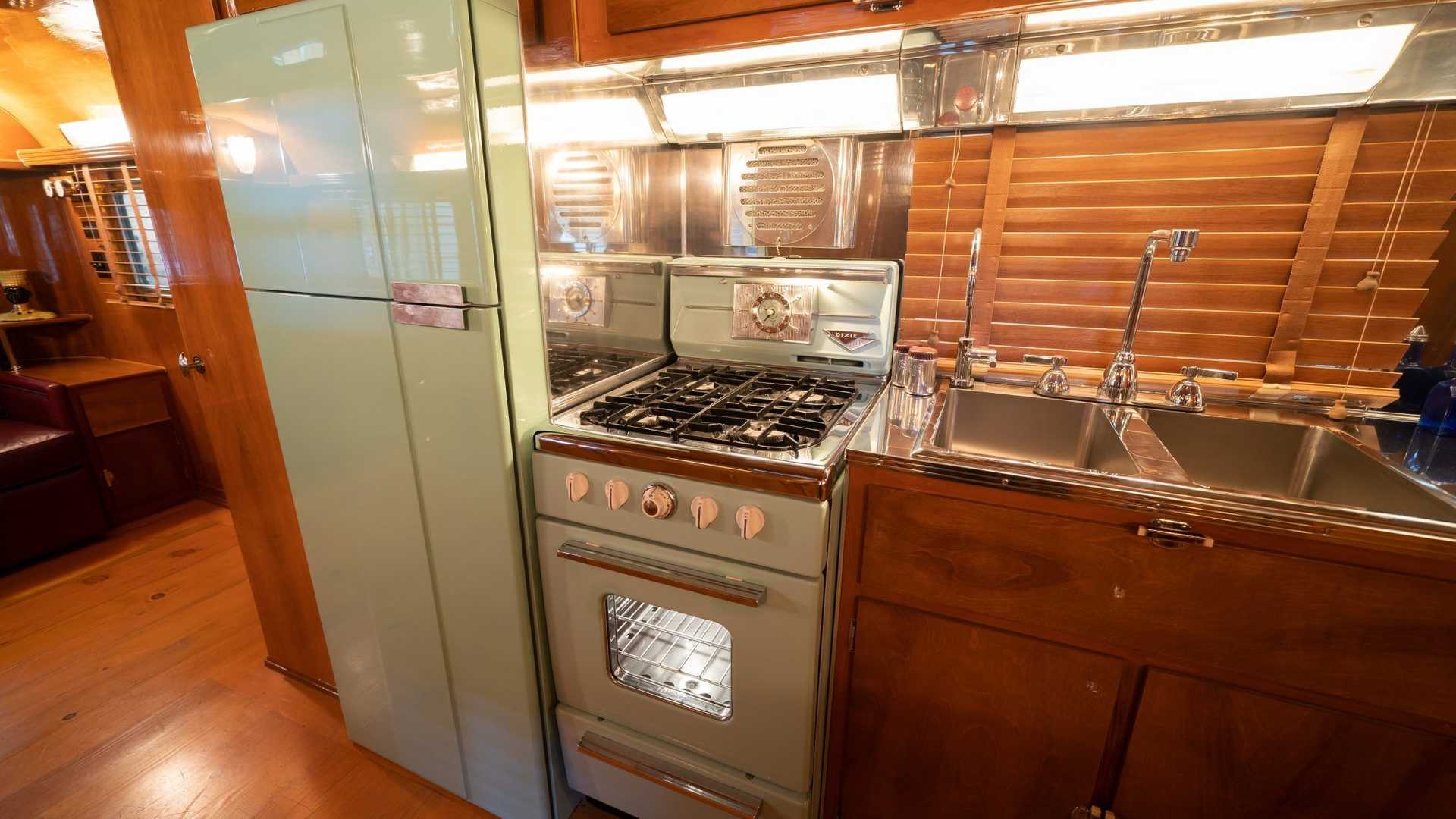 A unique feature called a “Pullman roof” allows over six feet of standing room. Only the Capistrano model featured seven windows on each side of the roof. The restored tongue features two polished aluminum propane tanks with period fittings. Those old-growth knotty pine floors were removed, refinished, and reinstalled.