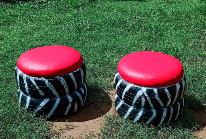 Another great idea is to create custom outdoor seating by repurposing old tires into comfortable stools or chairs. Add cushions or upholstered tops to the tires, and they become a practical and chic addition to any patio or garden. The rubber’s durability makes it perfect for outdoor use.
