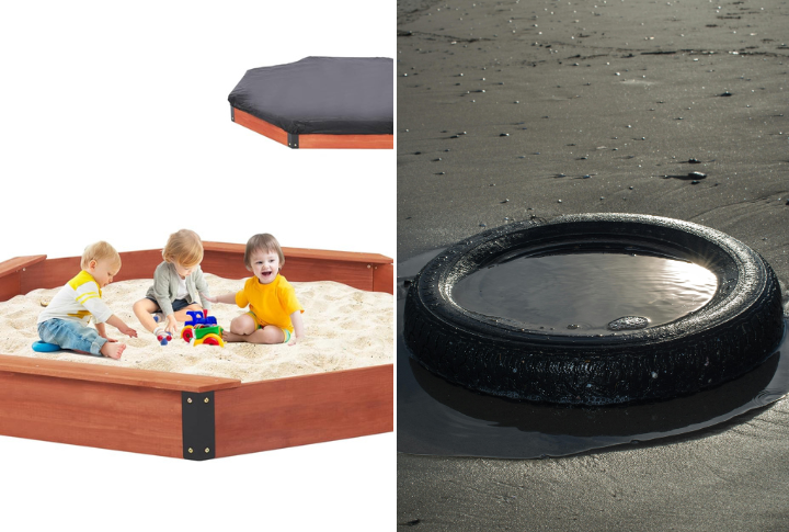 A tire sandbox is a clever and compact way to entertain kids in your backyard. You can either use a big tire or cut up smaller tires to create a perfect frame for a child-friendly sandbox. Simply fill it with sand and let the kids enjoy hours of fun.