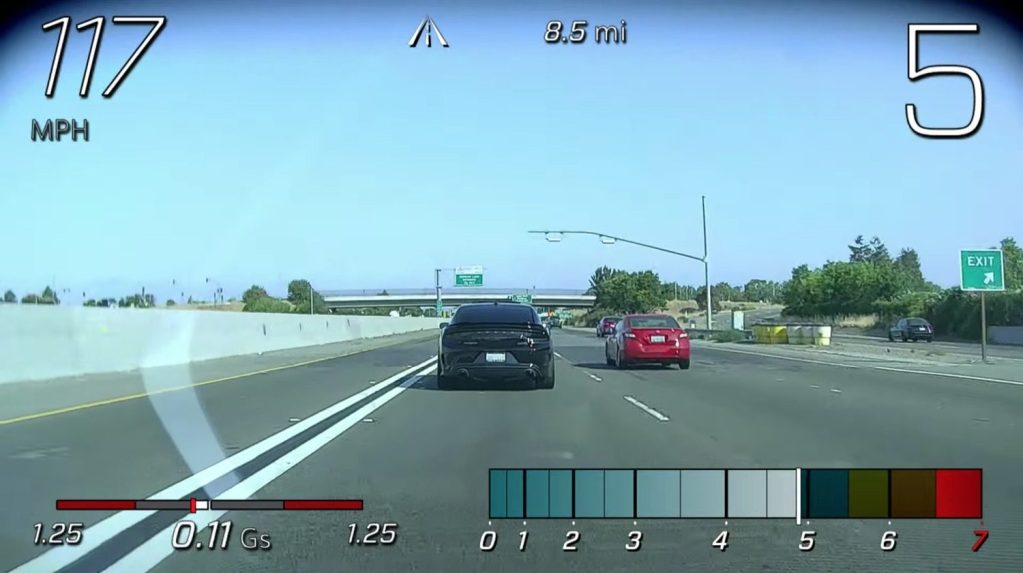 The performance data recorder caught the dealer tech reaching speeds of 100 mph on several occasions. Maybe that’s part of determining he fixed the problem, maybe not. Encountering a Dodge Charger, the video shows the tech racing him on Fremont streets reaching speeds of 148 mph.