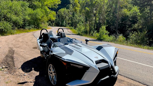 The Slingshot feels surprisingly planted, given its three-wheel setup, but that’s not to say it can’t carve corners like a well-honed chef’s knife. The 255-mm width rear wheel in the SL model could be considered a member of the “lifestyle” considering how much it likes to swing, at least under hard acceleration. However, I didn’t encounter a singular-rear-wheel drift that wasn’t easily controlled with some throttle manipulation. The Slingshot may not ride as if it were on rails, but thrashing around curvy tarmac will undoubtedly put a smile on your face.