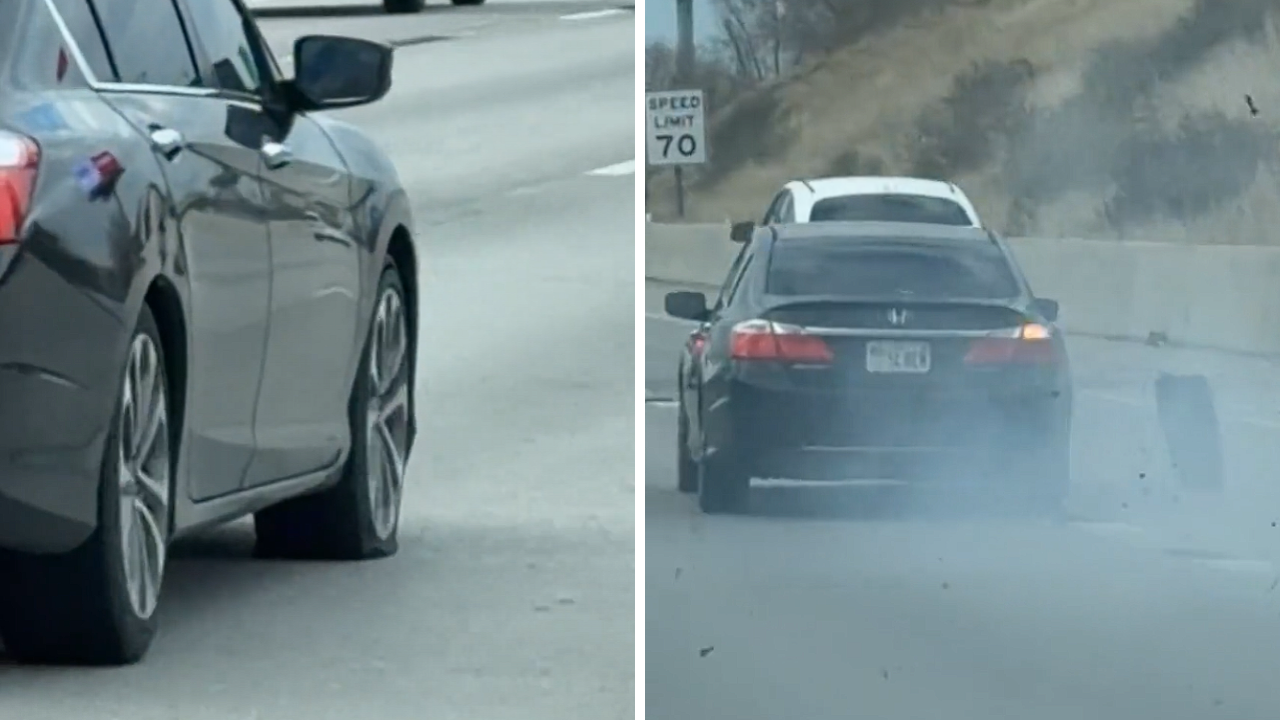 The video recently went viral on the popular Reddit community r/IdiotsInCars. In the clip, a dark-colored Honda Accord is seen traveling at highway speeds in the middle lane. At first glance, it might look like a normal commute, but a closer look at the front passenger side reveals the car is driving entirely on a blown-out tire.