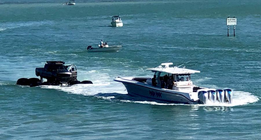 So a boat pulled the truck contraption back to shore while surrounded by the Coast Guard, Sheriff’s office, and Department of Natural Resources. A helicopter flew above in case the surrounding support couldn’t ward off any danger. As the truck isn’t licensed as a boat and has no means to navigate the waters, and those waters being environmentally protected, there must be citations flying around.