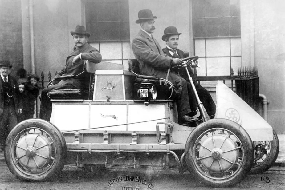 Before he’d named a sports car company after himself, Porsche was experimenting with different powertrains. This makes sense because at the turn of the century, no one was sure if petroleum cars would prove the best means of transportation. So Ferdinand Porsche teamed up with Ludwig Lohner and they built a prototype for the Paris Exposition, like nothing the world would see for another century. It had small electric hub motors inside the wheels and a large cell battery. They named this early EV the Semper Vivus.