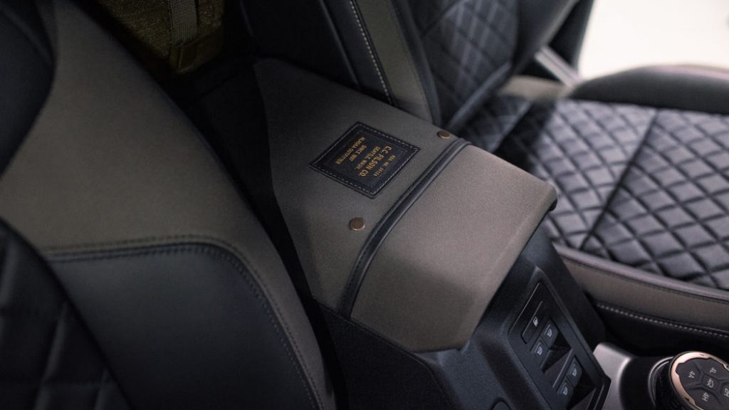 Filson bridle leather straps hold the rolled-up soft top made from fireproof nylon. Black quilted leather with green canvas panels is featured throughout the Bronco’s interior. The theme is carried over to the door bolsters and armrests. Grab handles are painted green with a brass Bronco logo emblazoned on the steering wheel.