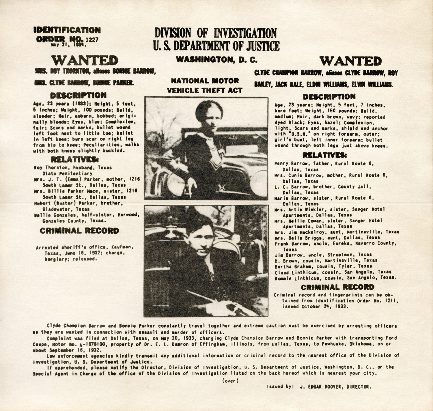 According to the FBI, Bonnie and Clyde were shot near Sailes, Bienville Parish, Louisiana. This was after “one of the most colorful and spectacular manhunts the nation had seen up to that time.” Clyde was wanted for murder, robbery, and kidnapping at the time. Bonnie was his sidekick, guilty of a variety of crimes as well.