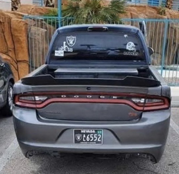 This thing is stitched together worse than Frankenstein. From a dead-rear view, it looks like it might come together. But walking a few steps around to see the Charger rear hung from the Dakota bed is frightening. What looks like such harmony becomes WTF in an instant. At least the Charger bumper cover and Dakota bed are matching colors.