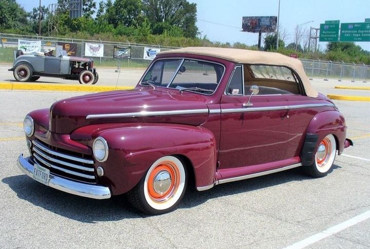 The 1948 Ford Super Deluxe was notable for its innovative use of a single-piece curved windshield, which improved visibility and became a significant design trend in the industry. The Deluxe is known for its prominent chrome grille, sweeping fenders, and a smooth, rounded profile. Its 1948 edition had a 239 cubic-inch (3.9-liter) flathead, 100-horsepower, V8 engine, and a three-speed manual transmission; its interior showcased plush seating and a well-equipped dashboard.