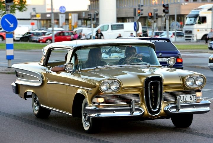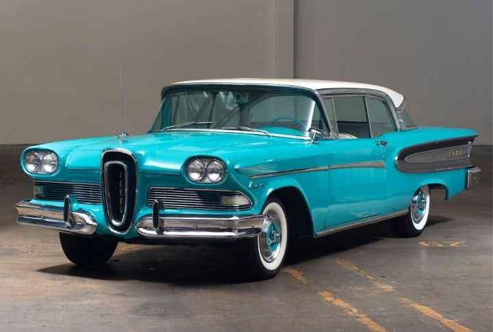 Edsel released the Citation in 1958, positioning it as one of the brand’s most luxurious versions. The one found at All American Classics has a bold front grille with an unusual “horse collar” design and vertical headlights that distinguish the car. The Citation’s body showcases a sleek, low-slung profile with dramatic fins and a sweeping rear end. A 361-cubic-inch, 303-horsepower V8 engine and a push-button transmission serve as its powertrain.