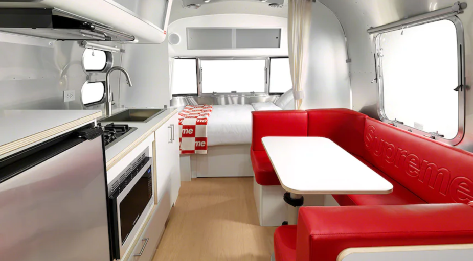 Supreme, not exactly known for its subtlety, made a point to drench the Airstream in its bold red and white signature branding. Easily the most Supreme-ish logo is the loud, red extendable awning with “Supreme” printed in white across the top. The exterior is also littered with Supreme badging. Inside, there’s a red-upholstered “ultraleather” couch, a branded blanket, and custom flooring. There are, somehow, even more, Supreme badges inside.