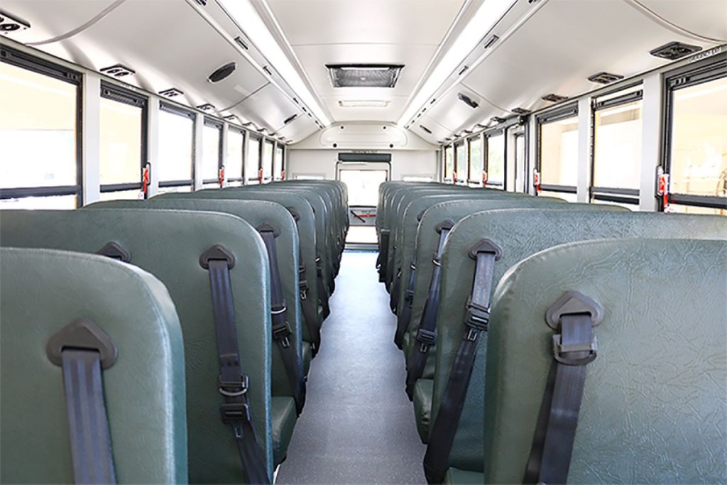 The GreenPower BEAST school bus can seat up to 91 people, including the driver. Like most other school buses, all of the seats in the BEAST are front-facing. There are 15 rows, with two benches for each row and three seats for each bench. The BEAST is ADA compliant for transporting individuals with special needs. For storage, the BEAST has a full pass-through cargo compartment.