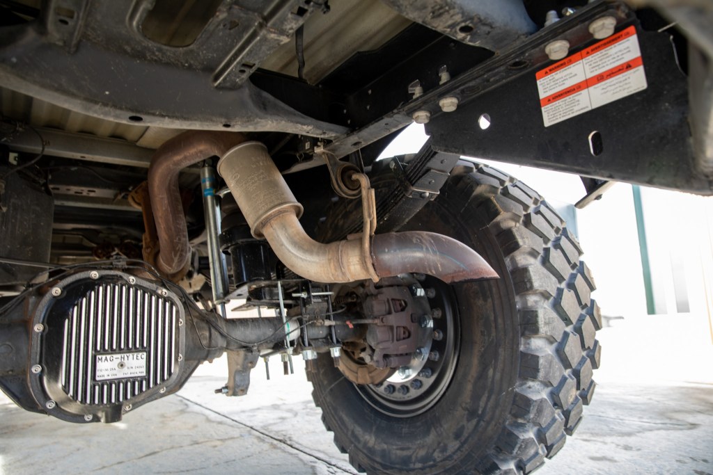 The company essentially removes all the bodywork in front of the cabin, as well as the bed. The frame beneath the bed gets additional bracing welded-in, and the bed gets reinstalled with a spray-in bed liner. The sides of the bed, as well as the hood and front bumper, are then replaced with fiberglass versions. The hood now opens forward, and to support it, MegaRexx welds in a steel halo and installs nitrogen gas shocks. These new panels, which are flared, are needed for what else MegaRexx installs.