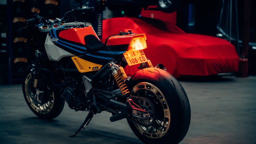 While the Black Swan reworks the Indian FTR, Workhorse Speed Shop’s other custom build highlights its original spirit, instead. No, it’s not a flat-tracker, but the ‘FTR AMA’ does pay homage to 1980s AMA racers and vintage rally cars. Hennebert lists the Lancia Delta HF as a notable inspiration, Bike Exif says, though the custom bike’s Martini-style livery was a customer request.