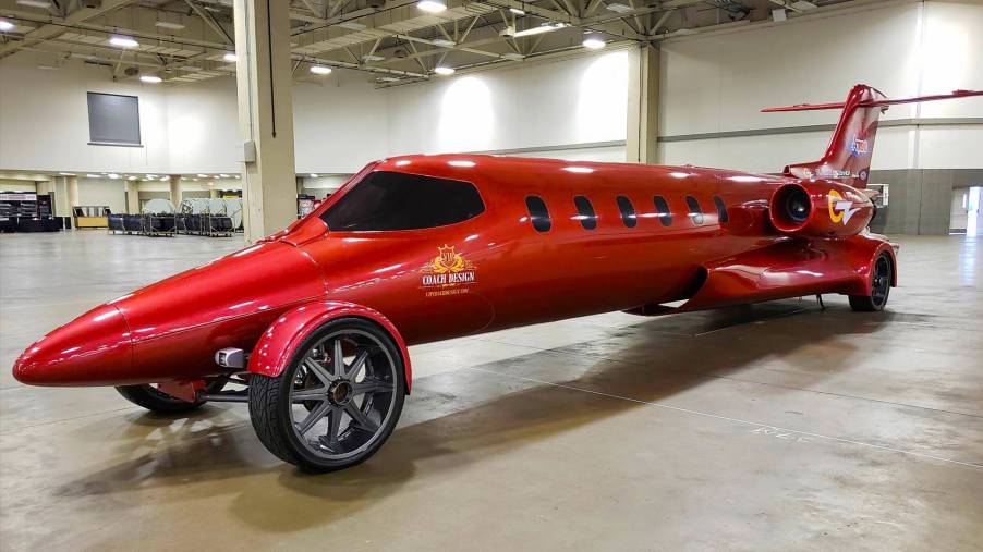 Those wheels look in proportion to the rest of this private jet on wheels, but they’re 28-inches tall. The original wings mounted onto the body were removed, and sweeping bodywork was fashioned in its place. This covers the rear wheels and also houses the taillights.