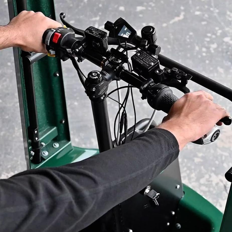 With its low center of gravity and four wheels, even when loaded with cargo the eQuad is a stable vehicle. There is no steering wheel. Instead, it has handlebars like a bicycle. But it does have disc brakes.