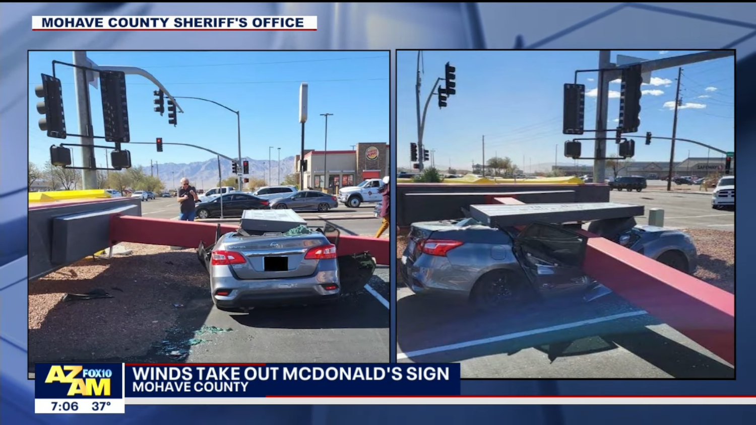 The National Weather Service had issued a high-wind advisory that day in Phoenix. Peak wind gusts in the area were around 29 mph in the Phoenix area, with even higher gusts of 58 mph in Imperial. The area has been experiencing higher than usual winds, but how does a huge sign fall on a customer’s car like that? It appears the McDonald’s had recently been remodeled but the sign looks older.