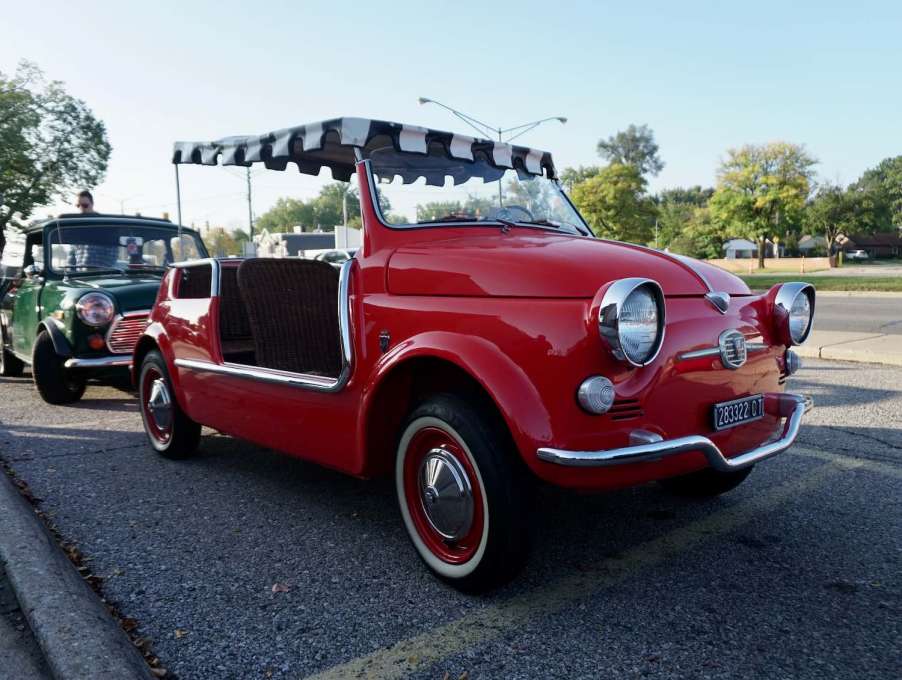I was wandering between the rows of collectible classic cars and shiny new supercars at a Detroit area Cars & Coffee meet when something caught my eye: a cute little Fiat with wicker seats and a fringed canvas top. I snapped some pictures, then went home and looked it up. This 1959 Fiat 500 Jolly–a time capsule of 1950s and 60s opulence–was actually one of the rarer vehicles at the entire show! Here’s how this unique runabout came to be.